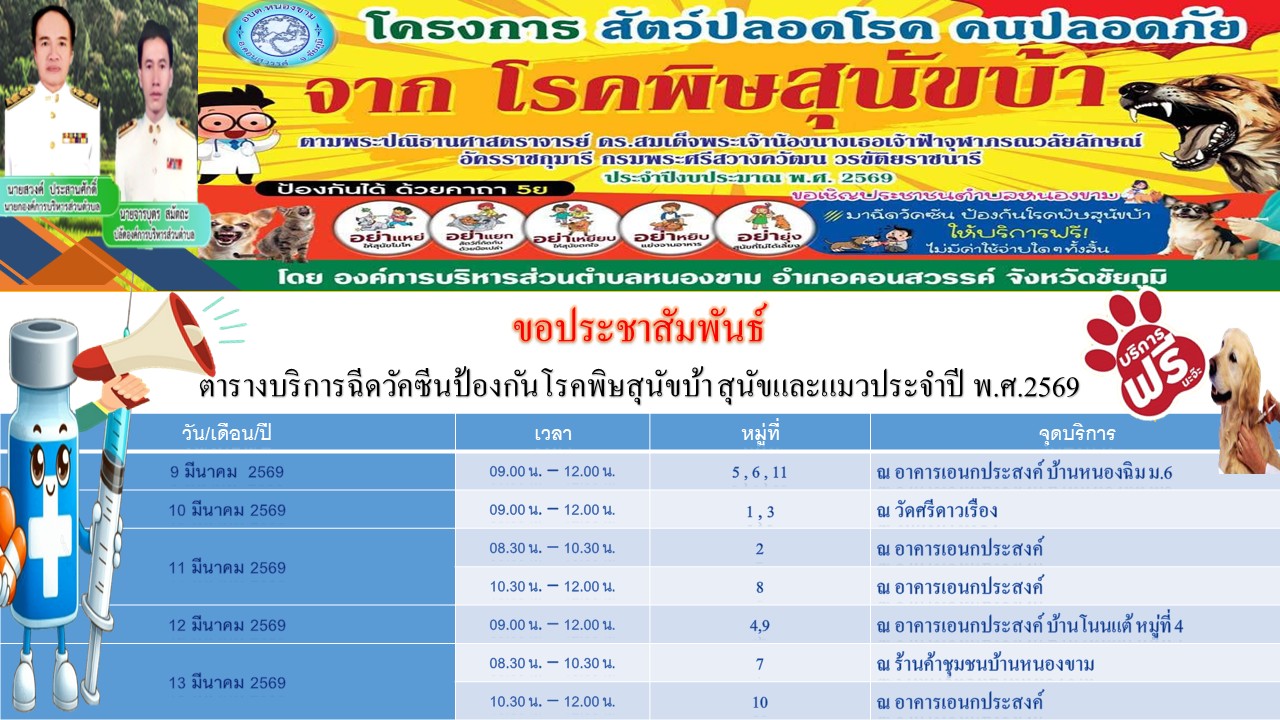 องค์การบริหารส่วนตำบลหนองขามขอประชาสัมพันธ์ออกหน่วยบริการฉีดวัคซีนป้องกันโรคพิษสุนัขบ้า ประจำปีงบประมาณ พ.ศ. 2569 |