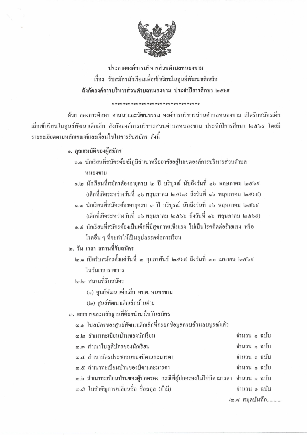 ประกาสรับสมัครนักเรียนเพื่อเข้าเรียนศูน์พัฒนาเด็กเล็กสังกัด อบต.หนองขาม 2569